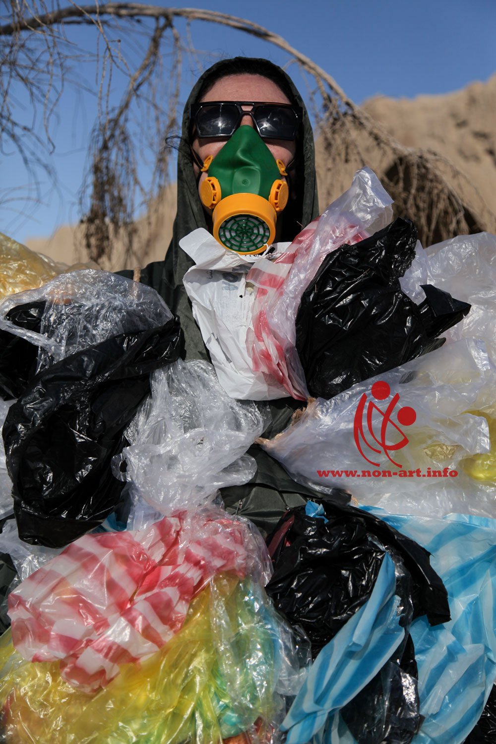 The first day: The performer comes out of a deserted garden in a hazmat suit with a basket. She tries to gather the plastic wastes in farm lands. She puts a string between two electricity poles and hangs the plastics like wet clothes. The agenda behind such action is to let random passengers -probably the same ones who abandon their wastes in nature- see what we have done to earth-ourselves for just a few seconds. The performer crosses different roads and gathers more and more plastics hanging them to her clothe. When she arrives the city she is fully covered with plastic wastes.
